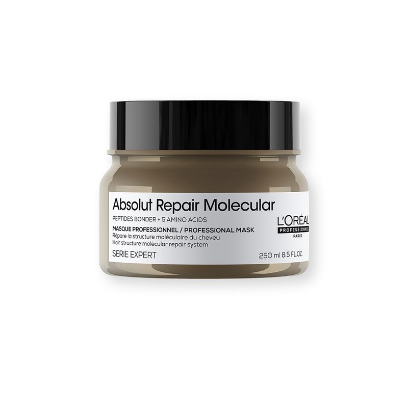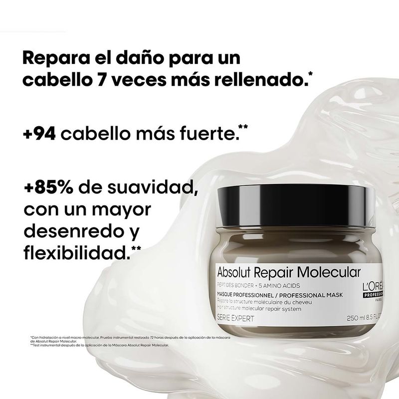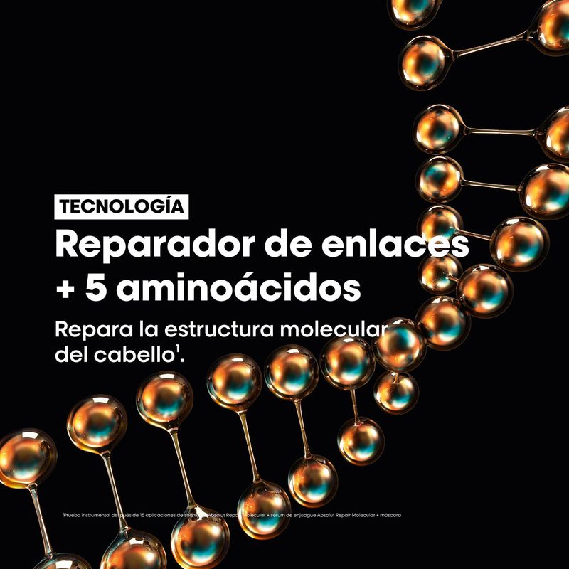 Descubrimiento científico: Absolut Repair Molecular. Repara 2 años de daño en un solo uso*. Por primera vez, la Investigación Avanzada de L’Oréal Investigación Avanzada ha logrado descomponer los péptidos para inyectar sus componentes por separado en la fibra capilar**. Una vez dentro, estos componentes se recomponen y reconstruyen la estructura molecular del cabello***.