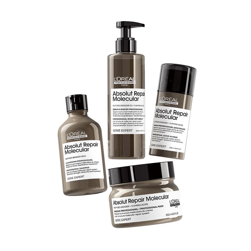 Descubrimiento científico: Absolut Repair Molecular. Repara 2 años de daño en un solo uso*. Por primera vez, la Investigación Avanzada de L’Oréal Investigación Avanzada ha logrado descomponer los péptidos para inyectar sus componentes por separado en la fibra capilar**. Una vez dentro, estos componentes se recomponen y reconstruyen la estructura molecular del cabello***.