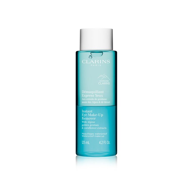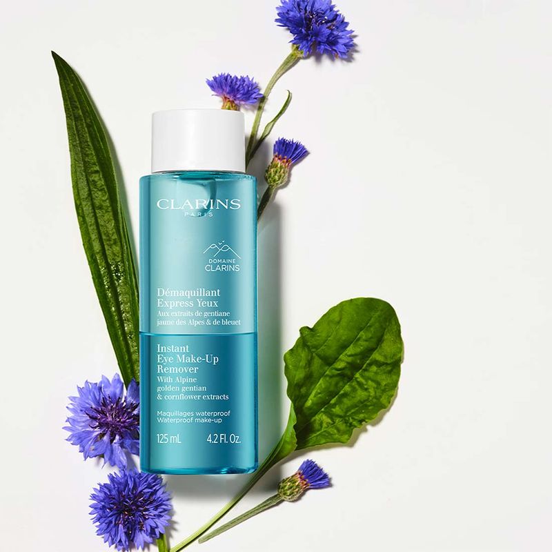 Este desmaquillante exprés para ojos está dirigido a las mujeres que adoran el maquillaje intenso o resistente al agua y quieren cuidar sus ojos. Su fórmula bifásica sin efecto graso elimina el maquillaje resistente al agua con suavidad. Enriquecido con extracto de genciana amarilla bio de los Alpes recolectada en el corazón de la Hacienda Clarins y extracto de aciano bio para una piel del contorno de los ojos calmada.