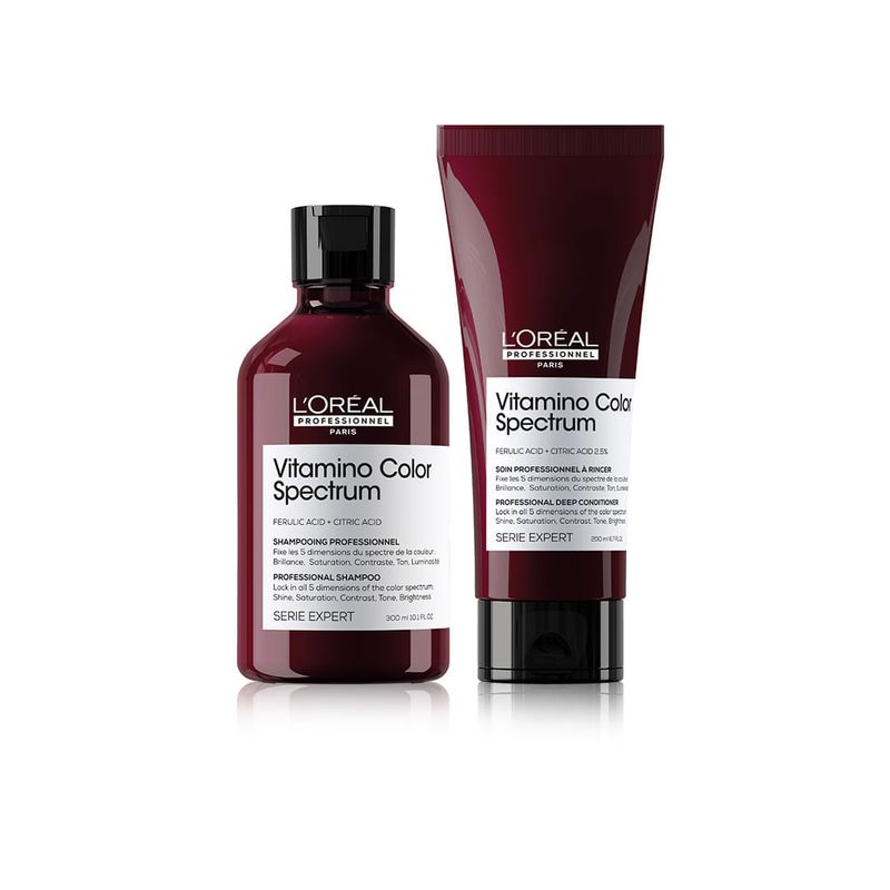 Acondicionador Vitamino Color Spectrum de L'Oréal Professionnel, formulado con Ácido Ferúlico y hasta 2,5% de Ácido Cítrico. La rutina completa mantiene las moléculas de color en el interior de la fibra para conservar el color vibrante como el primer día hasta por 100 días. El acondicionador tiene una textura cremosa que penetra en la fibra capilar para fortalecer el cabello desde el interior.